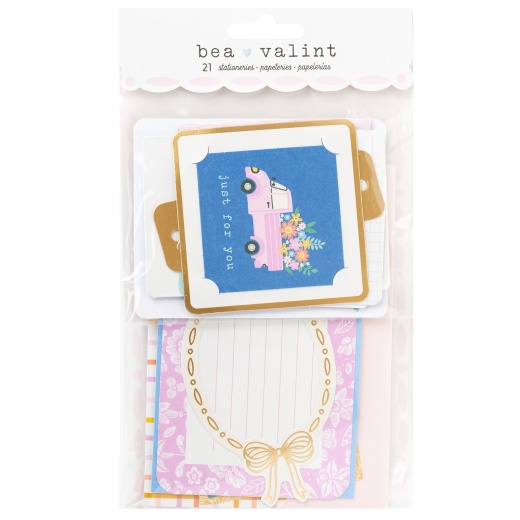 American Crafts Poppy And Pear Stationery Pack 21 Pieces Full of all things feminine and charming, Bea Valint's collection is a pleasant trip through a country village with flowers, fruit, critters, and trees. A beautiful variety of floral prints contrast will with whimsical Hungarian-Inspired folk art. This well-rounded collection inspires new beginnings and finding beauty and motivation in the everyday. Send beautiful letters or add delicate stationary designs to your projects with this Stationery Pack. With 21 beautiful stationary papers and envelopes with a gold foil finish you'll easily find a way to incorporate these into your projects.
