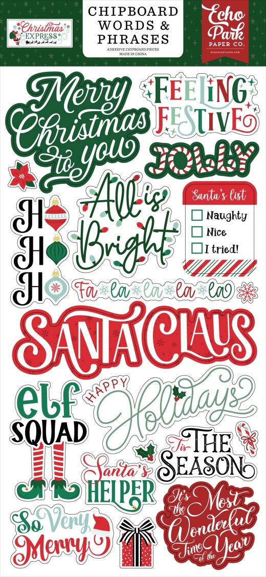 Echo Park Chipboard 6"X13" Word & Phrases, Christmas Express While you need the perfect paper to start your project, you also need the perfect embellishment to finish your project! Embellishments can add whimsy, dimension, color and style to greeting cards, scrapbook pages, altered art, mixed media and more. This package contains Echo Park Chipboard 6x13 inches.