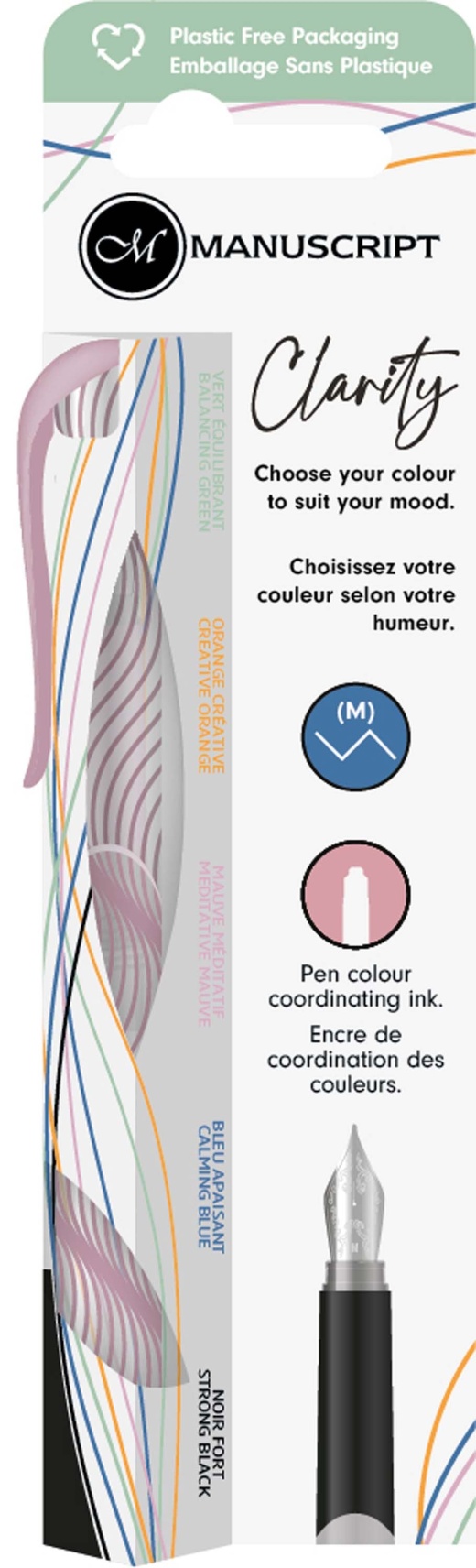 Manuscript Clarity Fountain Pen Pink Stand out with style with this vibrant fountain pen! The Clarity Fountain Pen ensures comfort and clarity with everyday writing. Suitable in the office, the pencil case or the pocket! This pen set comes with an iridium nib for everyday writing and 1 Colour coordinating ink included. Choose your colour to suit your mood and help create clarity of thought with Manuscripts Calming Fountain Pen range. Release worries, anxieties and stresses with the simple act of writing ones thoughts down on paper. Featuring Plastic Free Packaging for a sustainable future, utilising 100% recyclable board. This package contains one fountain pen and ink. Available in a variety of colors. Each sold separately. Imported.
