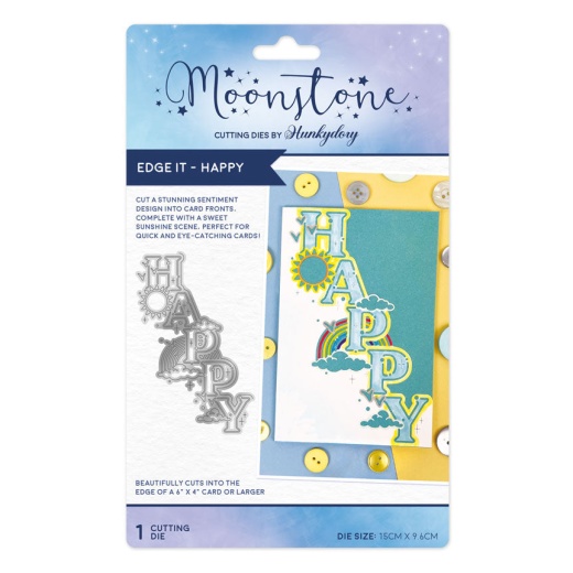 Create wonderfully happy card fronts in no time at all with the Moonstone Dies - Edge It - Happy die set. The set features a stunning sentimental design that will cut beautifully into the edge of a 6” x 4” card or larger. The design reads 'Happy' in a classic serif font surrounded by a cute arrangement of sunshine, clouds and a rainbow, and adorned with dots and sparkle. Cut the design directly into a card front or cut from Adorable Scorable Cardstock and layer over Mirri or Shimmer Card for a pop of colour. Alternatively why not try colouring the design using the range of Prism colouring mediums? Pair the design with existing stamps and dies from the fabulous For the Love of Stamps and Moonstone Dies ranges for unique sentiments every time.