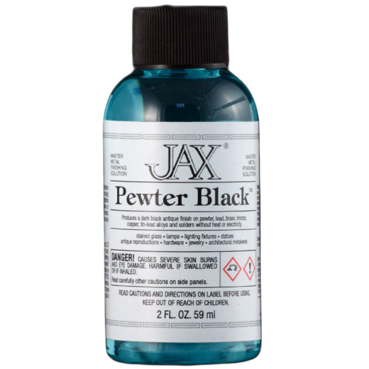 Use a bristle brush, sponge or rag and apply the JAX Pewter Black directly to the metal. You may also dip the entire object into the solution. However, do not leave the metal in the solution, or the solution on the metal, for longer than necessary. If the metal is clean, the JAX Pewter Black will work quickly. If left for too long the Pewter Black will rub off the metal easily. Practice and experience will help you find the right timing for your work.