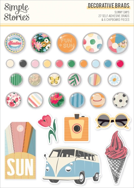 Sunny Days Decorative Brads 27 Brads, 6 Chipboard Add unique embellishments to greeting cards, scrapbooking pages, mixed media and all your craft projects with decorative brads and chipboard pieces.