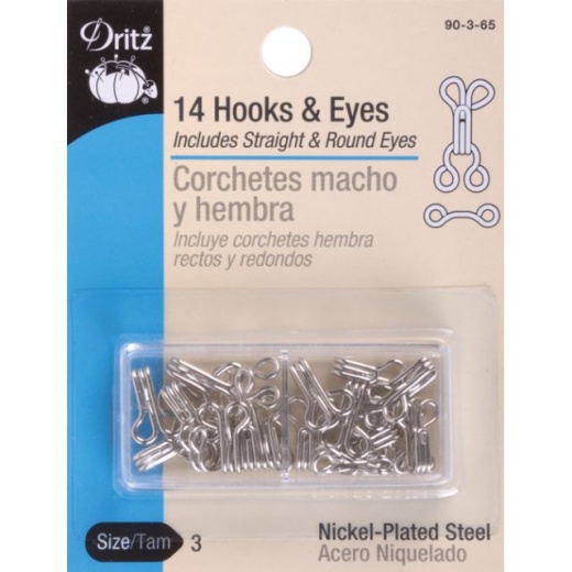 Hooks & Eyes Size 3 - Nickel - 7 Round Eyes - 7 Straight Eyes - 14 Hooks DRITZ-Hook & Eyes. Hook and eye closures are perfect for a little added security when accompanied by a zipper in slacks, skirts, dresses and much more. This package contains fourteen size 3 silver hooks, seven round eyes and seven straight eyes. Imported.