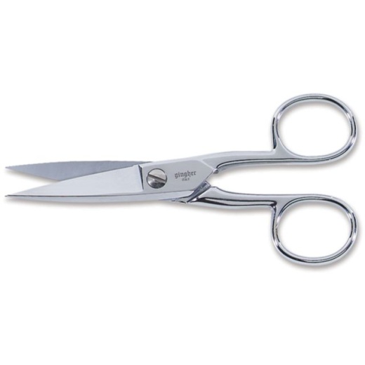 Knife Edge Craft Scissors 5" W/Leather Sheath GINGHER-Knife Edge Craft Scissors. These chrome over nickel scissors feature a knife edge, locknut assembly for easy readjustment of tension, and sharp points. They are strong enough to cut through many layers of fabric. This package contains one pair of 5 inch long scissors and a leather storage sheath. Imported.