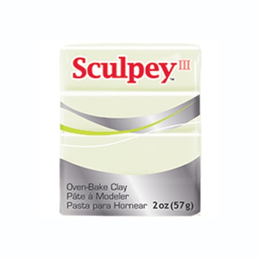 Sculpey III Polymer Clay Glow In The Dark Color - 2 oz Size SCULPEY-Sculpey III Polymer Clay. America's original oven-bake clay! Sculpey is soft and pliable, works and feels like ceramic clay but will not dry out when exposed to air. Perfect for everything from molded items to free form jewelry pieces, figurines, ornaments and scrapbooking embellishments. Shape, bake and once cool can be sanded, drilled, carved, glues, inked, painted with water based acrylics or Sculpey Brand Glaze. Weight: 2oz/56g. Available in a wide variety of colors. Conforms to ASTM D4236. Recommended for ages 8 and up. Made in USA.
