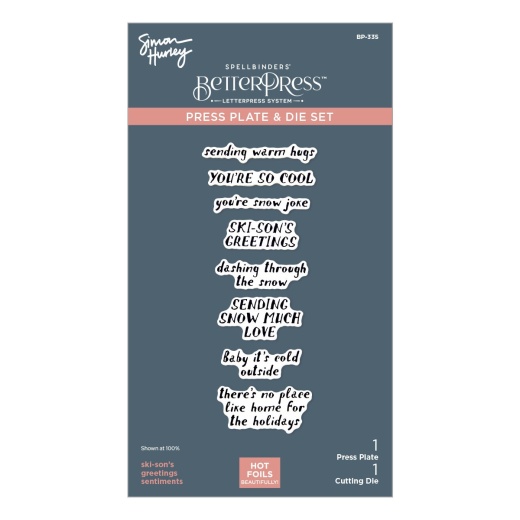 Spellbinders BetterPress Plate & Die Set by Simon Hurley Ski-Son's Greetings Ski-son's Greetings Sentiments BetterPress Plate & Die Set presses eight sentiments at once with one press plate, then die-cuts them all with the coordinating thin metal cutting die. A time saving set to get you started with eight sentiments. Use them individually or group them for a longer phrase. Works perfectly with the rest of this collection!