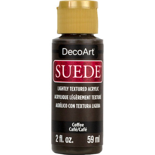 About DecoArt Suede -DecoArt Suede adds the rich, indulgent look of brushed suede to craft projects. This lightly-textured acrylic easily transforms your project with subtle dimension that instantly summons memories of these velvety, warm textures.DecoArt Suede Varnish adds a clear, velvety-matte finish to any DecoArt Suede project. This durable topcoat fuses with the paint to provide a strong layer of protection against daily use. Fully cured in 7-10 days. Water-based. Permanent. Soap and water clean-up.