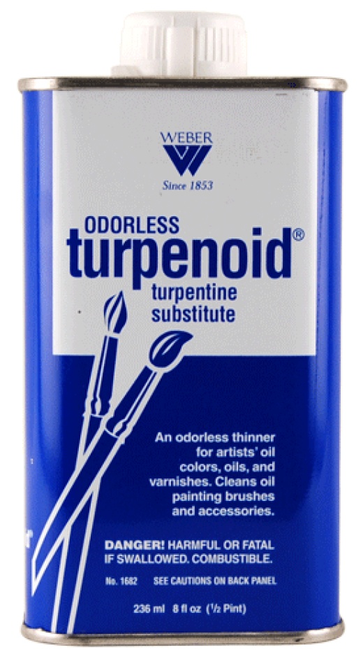 Turpenoid is an odorless, highly refined, water clear mixture of petroleum distillates. It is used as a thinner for artists' oil colors, oils and varnishes and as a cleaner for oil painting brushes, painting knives, other tools and accessories. Turpenoid is also useful for removing wet oil paint from clothing.