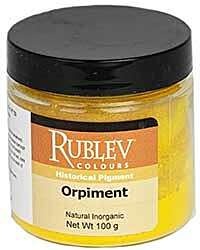 Orpiment is yellow arsenic sulfide, usually described as a lemon or canary yellow or sometimes as a golden or brownish yellow. It is designated as brilliant yellow in Munsell notation 4.4Y 8.7/8.9. Our orpiment is made from natural mineral sources near Kadamdzhay in Kyrgyzstan or Hubei Province, China, and is an intensely bright pigment of crystalline particles.