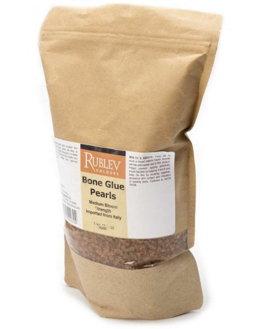 This is a high-grade glue made in Italy of pure bovine and porcine bones. It is a granular glue that is easy to dissolve in water. This makes it ideal for woodworking, chalk, and gesso grounds and as a medium for distemper painting.