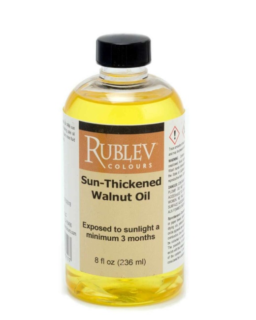 Rublev Colours Sun-Thickened Walnut Oil is made by exposing filtered, cold-pressed walnut oil to sunlight in shallow tanks covered with clear glass and exposed to the atmosphere for a period of at least three months. Exposure to sunlight thickens it. This walnut oil is naturally bleached to almost water white, so it can be used with palest colors and whites.