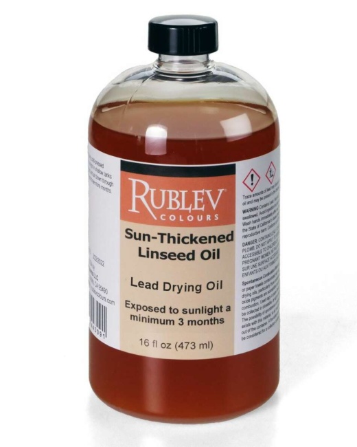 The color of sun-thickened linseed oil varies from that of sun-thickened walnut oil to darker colors due to the time of year it is processed and the manner of processing. It is typically faster drying than bodied linseed oil and will add gloss, leveling, and flow out to oil paint. This oil can be used as a medium or added to homemade paints and mediums.