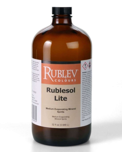 Rublesol Lite is a medium-evaporating, low-odor mineral spirits. It evaporates much more slowly than turpentine and slower than odorless mineral spirits, allowing more open time and prolonged work. It also makes colors more matte upon drying. Rublesol Lite evaporates completely and leaves no residue. The solvent is highly refined and has very low levels of impurities—such as sulfur, olefins, and benzene. The total aromatic content is less than 1%.