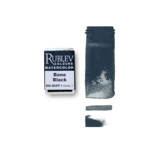 Rublev Colours Bone Black is made from charred animal bone and horn but not from ivory. It is a neutral opaque black that has high tinting strength and is highly staining. The term ivory black is currently applied to a high-grade bone black by other watercolor manufacturers, which is the same grade of bone black we use to make Rublev Colours Bone Black, but we specially make it for watercolors.