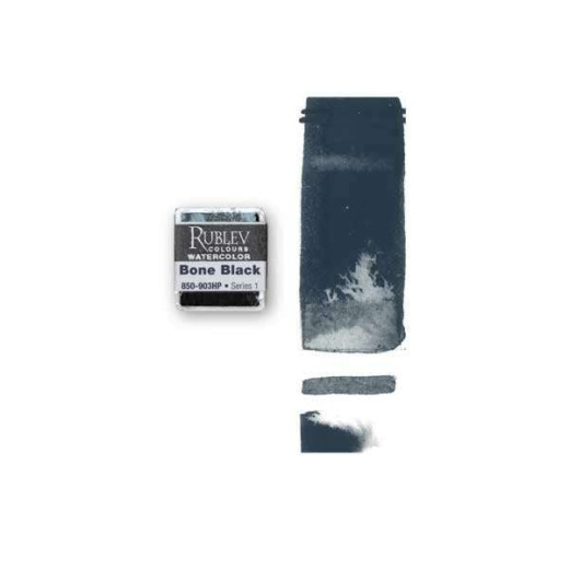 Rublev Colours Bone Black is made from charred animal bone and horn but not from ivory. It is a neutral opaque black that has high tinting strength and is highly staining. The term ivory black is currently applied to a high-grade bone black by other watercolor manufacturers, which is the same grade of bone black we use to make Rublev Colours Bone Black, but we specially make it for watercolors.