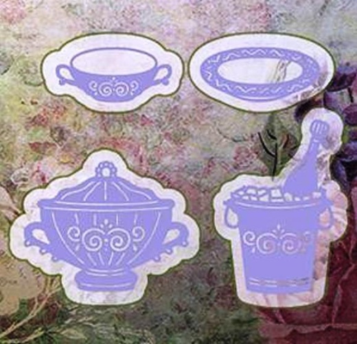 The die set includes a wine cooler, terrine, soup cup, and saucer, each with its unique shape and size. The soup cup measures 1 1/2" x 3/4", the saucer measures 1 5/8" x 3/4", the terrine measures 2 1/4" x 1 3/4", and the wine cooler measures 1 1/2" x 1 1/2". These dies are perfect for creating beautiful embellishments for your paper crafts, from delicate florals to intricate borders.