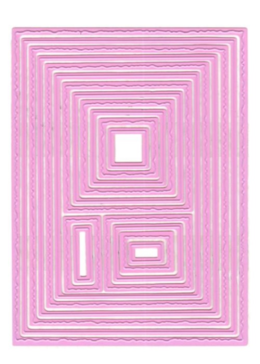 The collection includes six larger rectangle dies, six square dies, two small narrow rectangle dies, and four small rectangle dies. The largest die measures 3 5/16" w x 4 1/2" l, while the largest square die is 1 13/16" sq. The largest rectangle die measures 1 1/16" x 1". Notably, the die sizes decrease by 1/4" increment, allowing for seamless integration into your craft projects.
