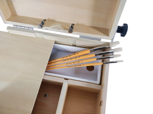 When not in use, the Brush Tray can be easily stowed away, freeing up valuable space in your artwork or storage container. However, when you're ready to create, simply clamp the tray to the side of your Guerrilla Box or the end of your palette, and you'll gain a convenient, expanded workspace. This clever feature enables you to have your brushes at your fingertips, streamlining your artistic process and boosting your productivity.