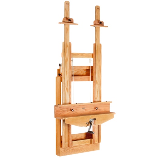 BEST's Wallmount is the ideal solution for the artist with limited studio space. Most easel manufacturers design only their smallest and lightest easels for quick and easy storage. BEST understands that many professional artists must achieve a balance between space concerns and workability. The Wallmount achieves both goals, a heavy duty easel that accommodates a large canvas with zero use of studio floor space. A sturdy oak easel that was designed to be mounted on the wall. The easel can be used in a vertical position or tilted forward. Perfect for the studio with limited floor space.