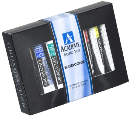 Set contains 8 7.5ml tubes of Grumbacher Academy Watercolor Paint.
