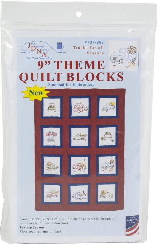 - 12 unique 9x9 inch quilt squares with vintage-inspired truck design