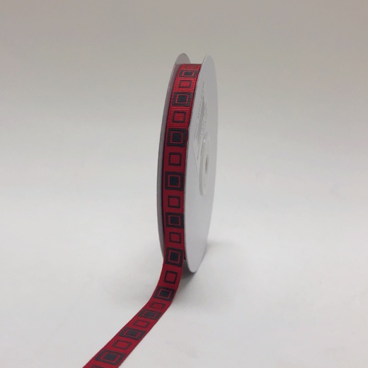 3/8 In | 25 Yd Black Grosgrain Ribbon W/ Red Square Design