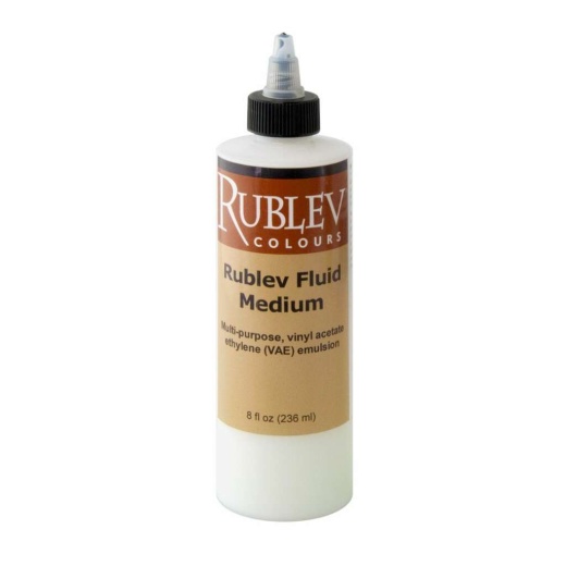Rublev Colours Fluid Medium is a multi-purpose, waterborne binder made from a vinyl acetate-ethylene (VAE) polymer emulsion. It comes in a convenient squeeze bottle and dries to a clear, soft, and flexible film. Unlike typical acrylic mediums, Rublev Fluid Medium contains no coalescing solvents (which means low VOC and no strong odor) and is APE-free, making it more environmentally friendly. Artists can use it in many ways: as a paint binder, a diluent/extender for existing paints, a protective sealer against support-induced discoloration on wood, a fabric sizer, or even a gentle ground primer. Notably, it “wets out” pigments exceptionally well – dry pigment powders mix in smoothly without intensive grinding, allowing artists to formulate their own paints more readily than with other polymer mediums.
